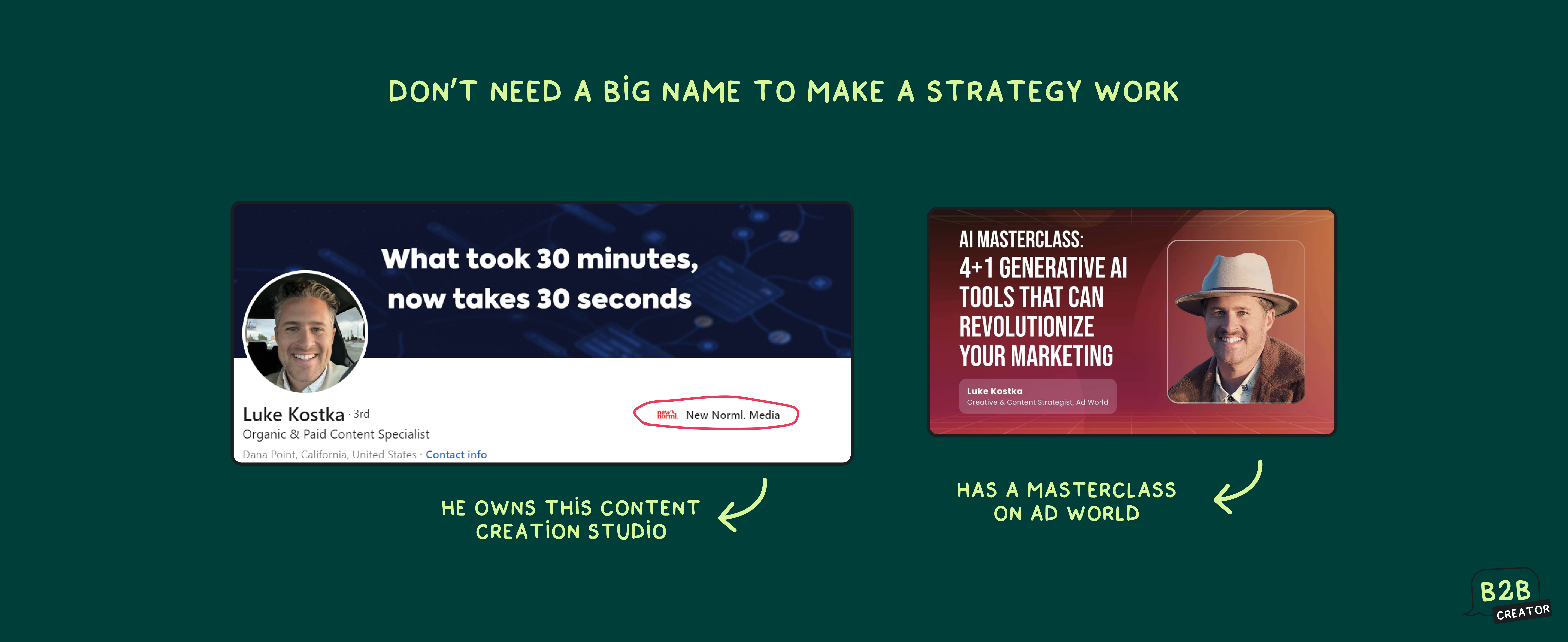 He actually grew AdWorld’s account before ClickUp, and has a masterclass on AdWorld, but indeed he doesn’t have such a strong personal brand on his social accounts.