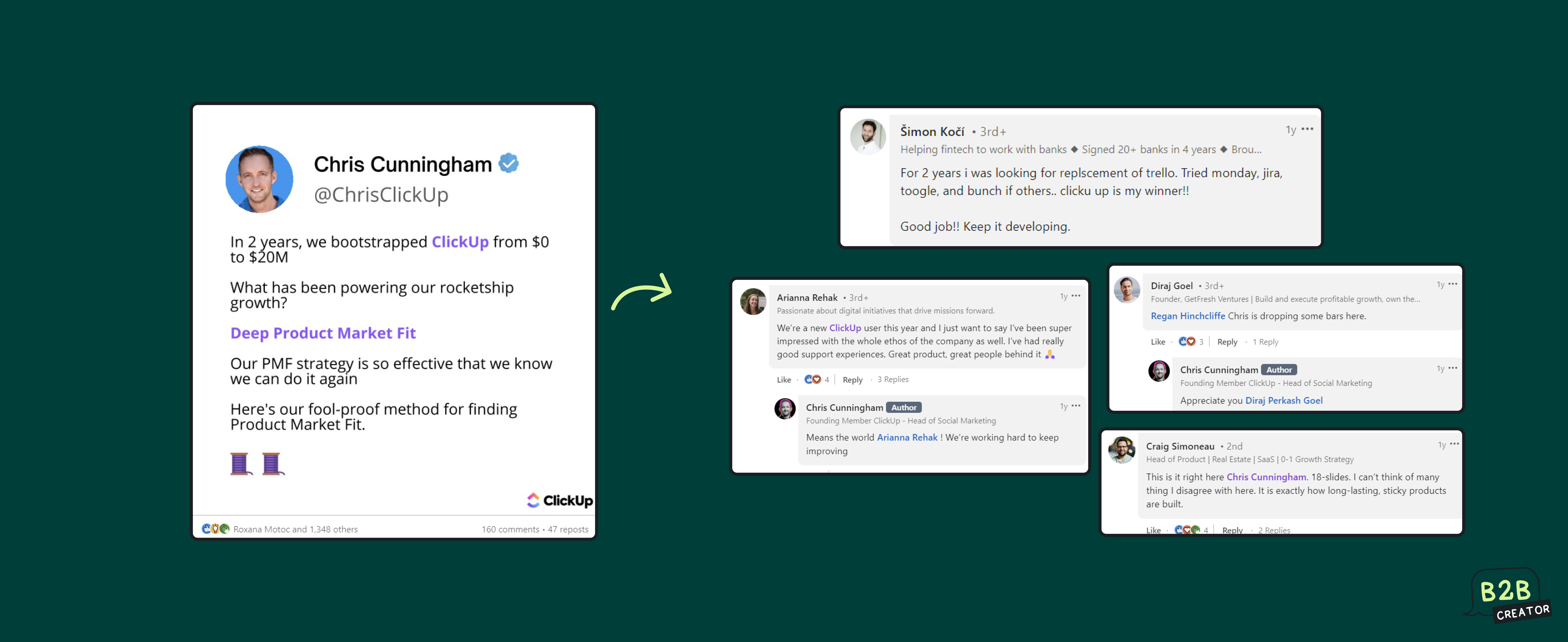 One thing Chris does really well on his social media accounts is that as opposed to selling ClickUp, he entertains and educates his audience about ClickUp.