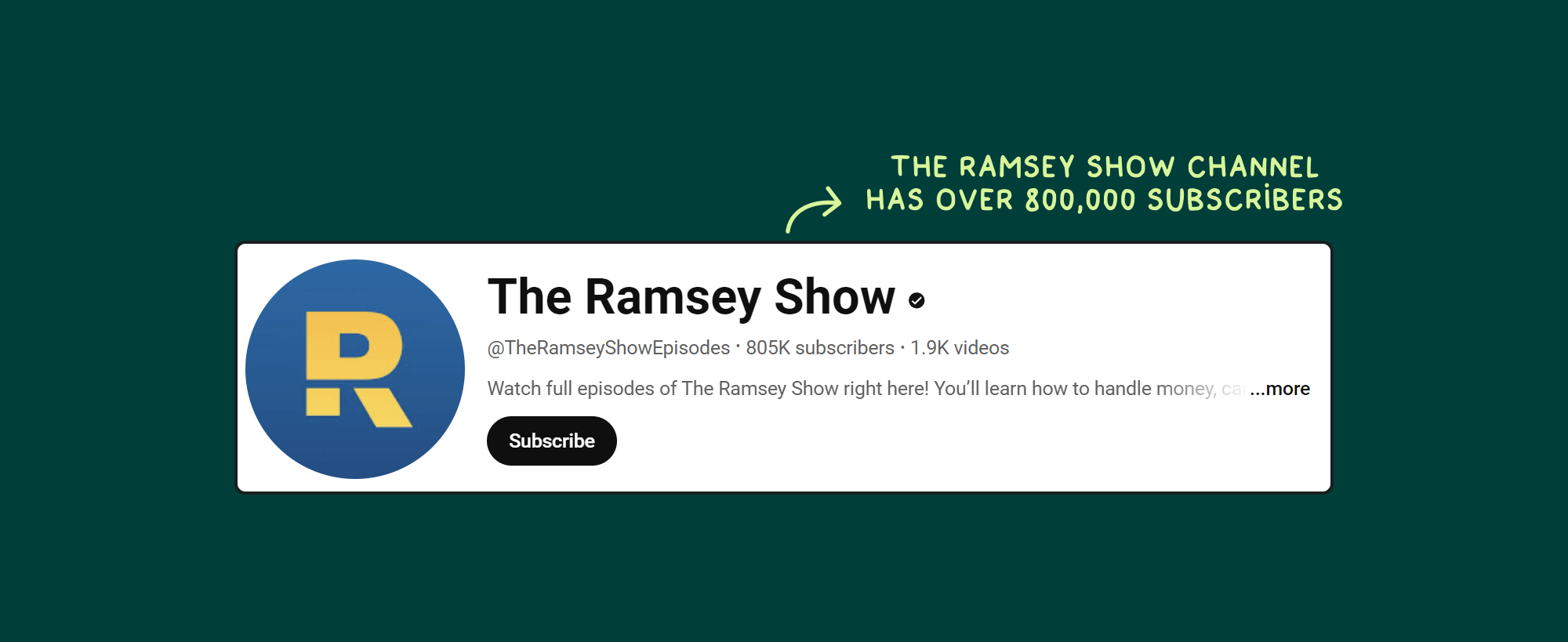 For example, The Ramsey Show channel has over 800,000 subscribers.