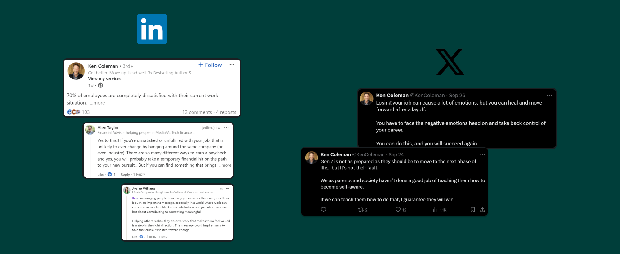 Ken also posts written content, especially on X and LinkedIn, which provides a more professional, thoughtful side to his brand.