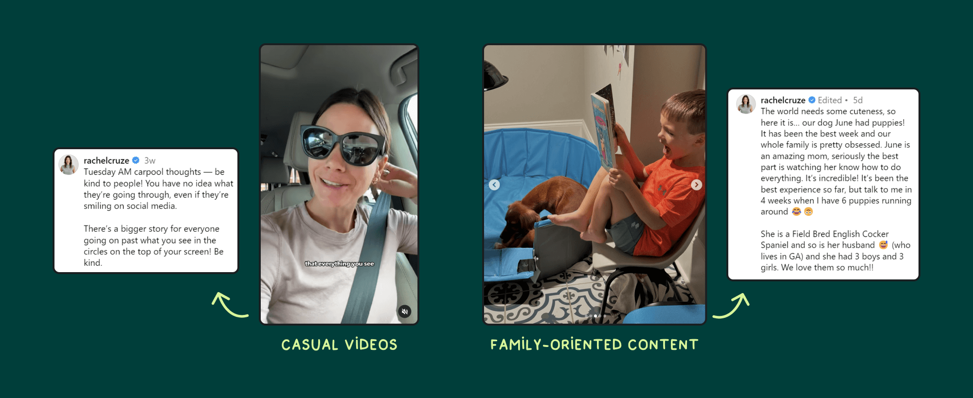 On Instagram and TikTok, she posts more casual videos, filmed in her car, or highlights from her shows, which create a relatable vibe. She also posts family-oriented content, giving a more personal touch.